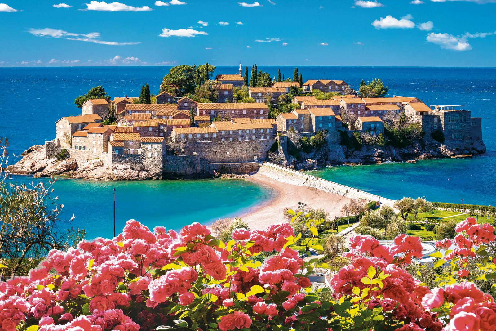 Lage: Etwa 2 km von Budva, in direkter Lage am Strand von Becici und umgeben von 40.000 m² idyl-lischen Gärten.