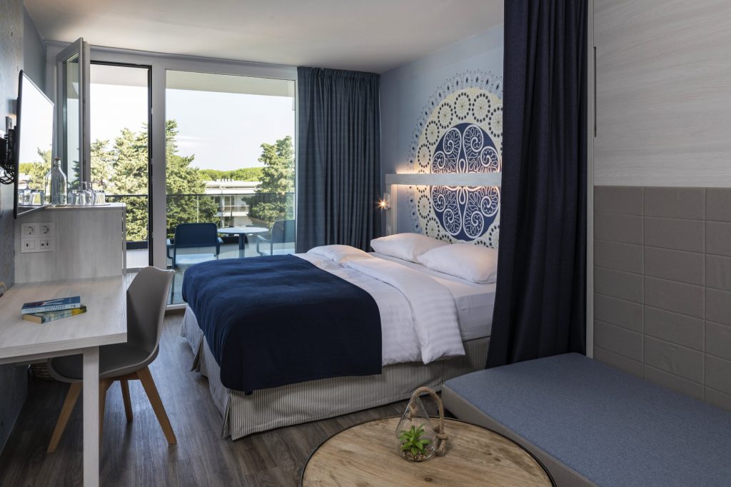 Ein gemütlicher Rückzugsort für zwei: Dieses Zimmer verbindet warme mediterrane Farbtöne, weiche Stoffe und moderne Akzente. Perfekt zum Entspannen nach dem Baden oder einem erlebnisreichen Tag. Einige Zimmer verfügen über einen privaten Balkon.